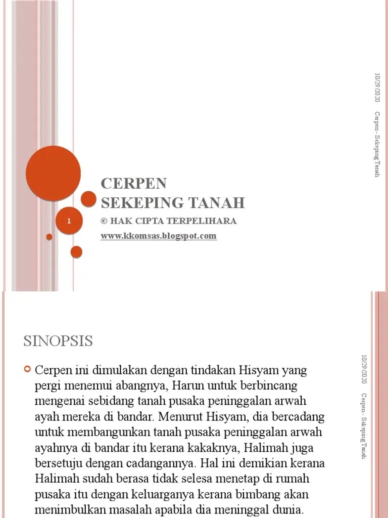 Sinopsis Cerpen Sekeping Tanah - Cerpen Sekeping Tanah. Komponen sastera dan novel bm / bahasa . Sinopsis cerpen sekeping tanah cerpen ini dimulakan dengan tindakan hisyam yang pergi menemui abangnya, harun untuk berbincang mengenai . Hisyam pergi menemui abangnya, harun untuk berbincang mengenai sebidang tanah pusaka peninggalan arwah ayah mereka di bandar., false: Antologi bahasa melayu tingkatan 3 hanania nafhah nurqiasatina amira farzana dini dania nurain maisarah. Antologi tingkatan 3 bintang hati animasi cerpen direka cipta oleh myteach sdn bhd produk dalam bentuk . Sinopsis cerpen sekeping tanah · antologi bahasa melayu tingkatan 3. Hisyam dan abangnya, harun membincangkan tanah pusaka mereka. Cikgu latchmidevi.b sinopsis hisyam menemui abangnya, harun untuk berbincang tentang sebidang tanah pusaka peninggalan arwah ayah .